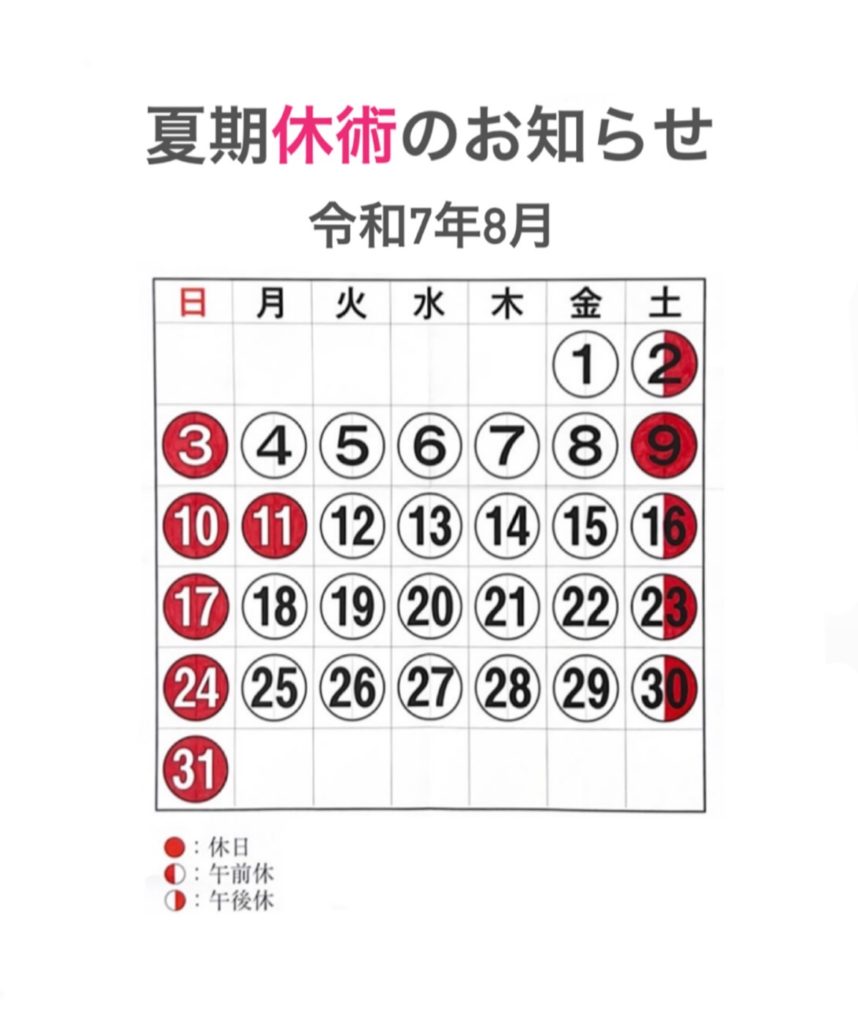 夏期休術のお知らせ 2025年7月8日 最終更新日時 : 2025年7月8日 yoshi 毎日毎日とにかく暑い!室内はエアコンで涼しくて外に出ると酷暑・・・体がついていかないですよね。みなさま、体調管理には十分お気を付けください☆吉村整骨院の夏期休日が決まりましたのでお知らせいたします!【9日(土)・10日(日)・11日(月・祝)】こちらの3日間を休術日とさせていただきますのでよろしくお願いいたします(^_-)-☆ Follow me!