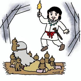 待ちきれなくなったイザナギは、髪にさしていた神聖な櫛の歯を一本折ると一つ火をともし、真っ暗な御殿のなかへ入っていきました。